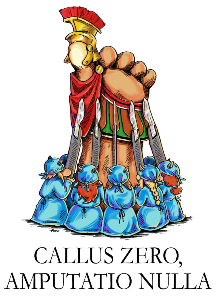 Para difundir el mensaje, el Consejo de Colegios de Podólogos ha diseñado unas camisetas que se dieron a conocer en primer lugar a los propios profesionales durante el 54 Congreso Nacional de Podología que se celebró en octubre en Gran Canaria. En ellas figura el eslogan “Callus Zero, amputatio nulla” y, emulando a los tebeos de Astérix, una imagen de un “pie romano” acechado por “una aldea de irreductibles galos” armados con instrumentos cortantes con aspecto de bisturí.